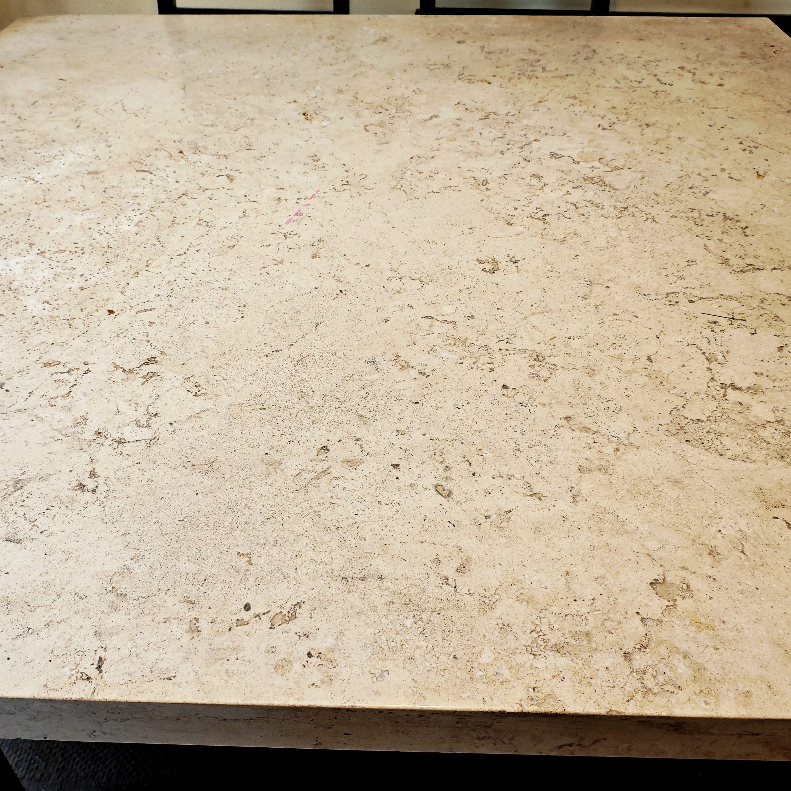 Mesa: cubierta de mármol color claro, base sólida en madera oscura.