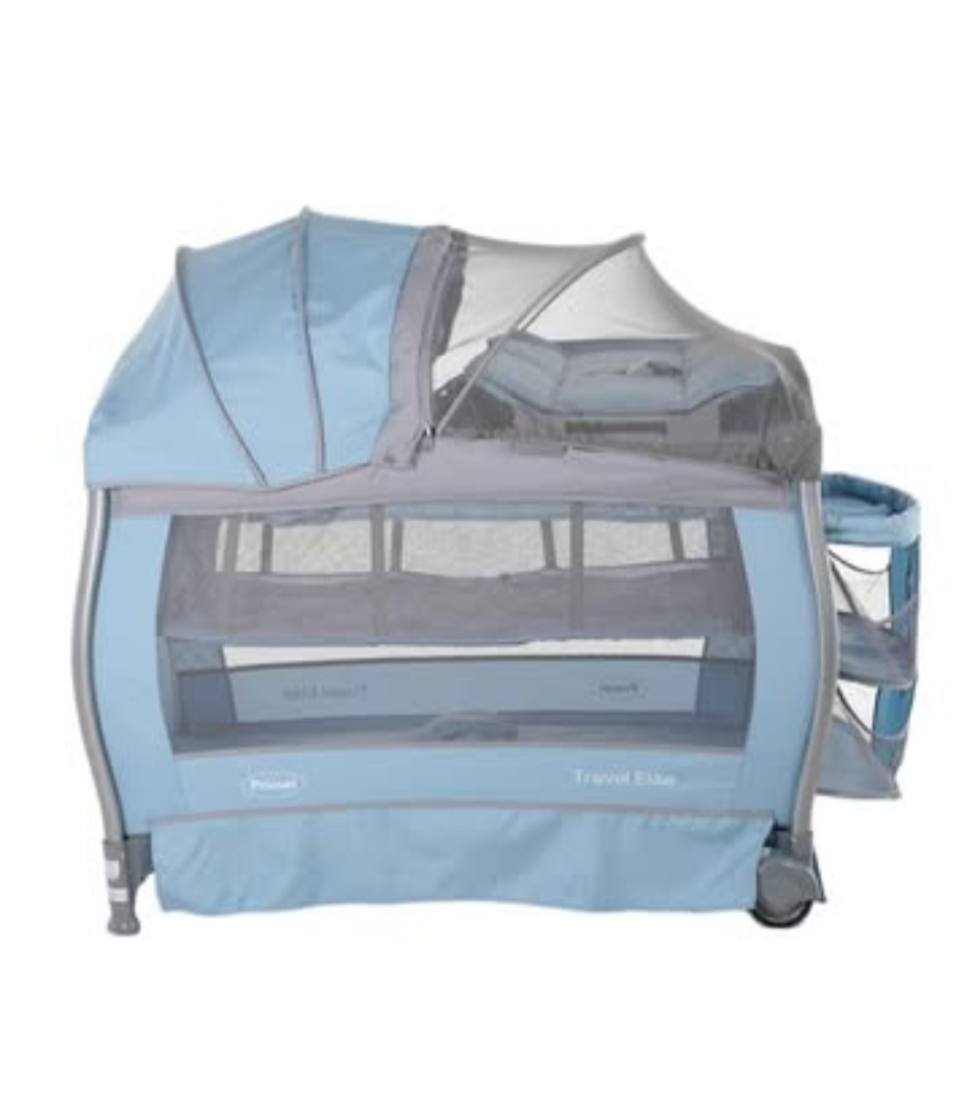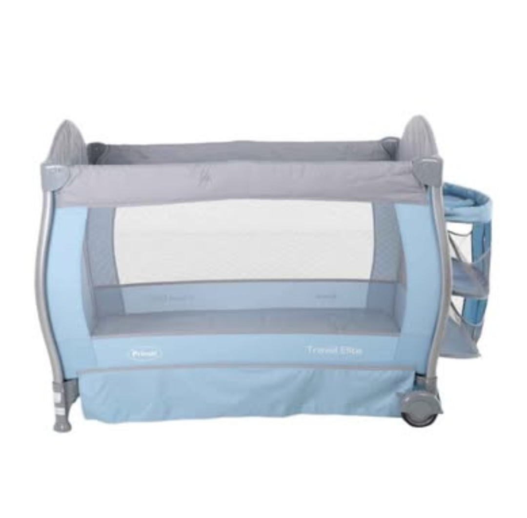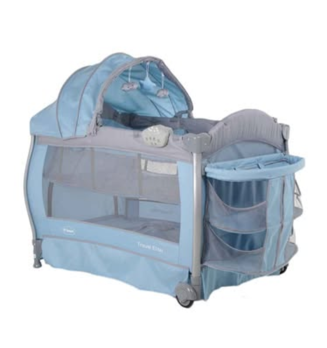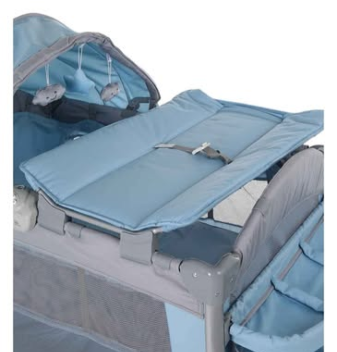 Cuna nueva en caja, con segundo piso y mosquitero, se convierte en mesedora, corral y tiene cambiador.