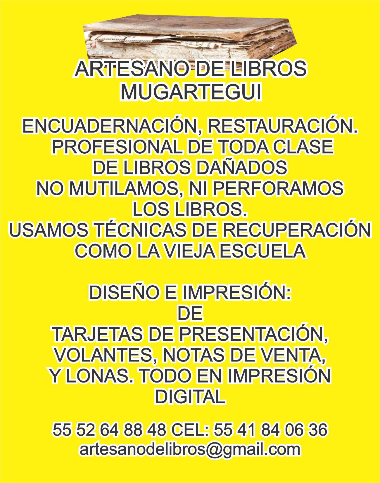 octubre 30, 2025 Views: 278 Id: 31443 ELABORACION O REPARACION DE LIBROS Report Report This ListingLogin Required Download Print Bookmark Share Share This Listing Categoría: Other Correo Electrónico: artesanodelibros@gmail.com Descripción: ELABORACION O REPARACION DE LIBROS Información del contacto Teléfono / WhatsApp: 5541840636 Dirección: Ciudad de Mexico Post New Review Cancelar respuestaYour Review Guardar mi nombre, correo electrónico y sitio web en este navegador para la próxima vez que haga un comentario. Your Rating Title of your review: Δ