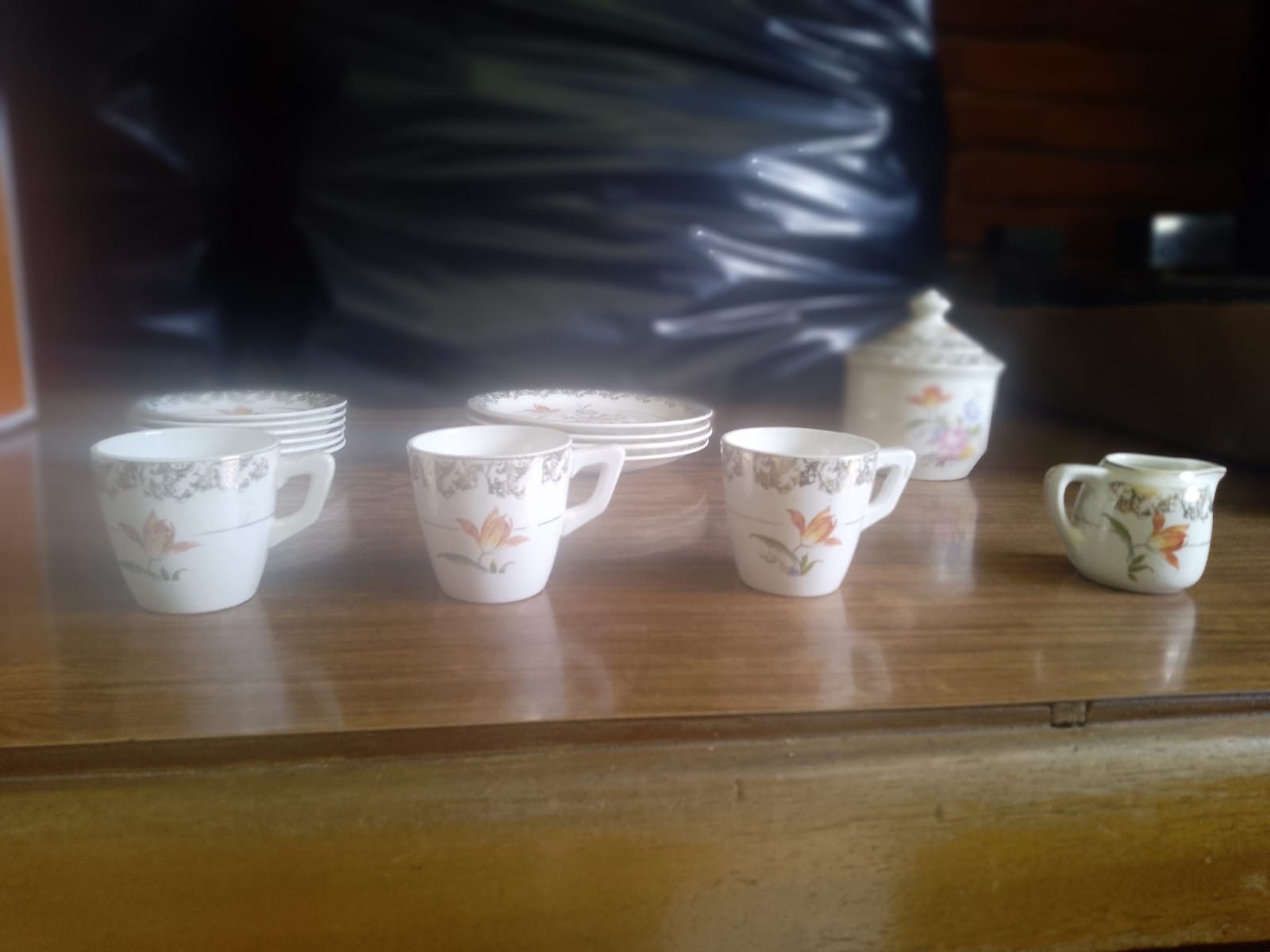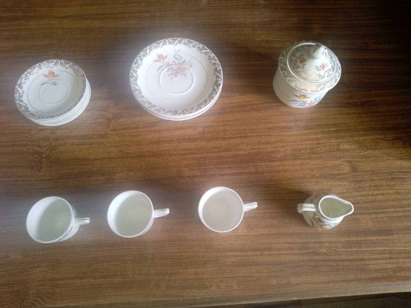 Juego de te consta de los siguiente: 3 tazas, 1 taza para leche, 4 platos para pastel, 6 platos para taza y 1 azucarera con tapa.
