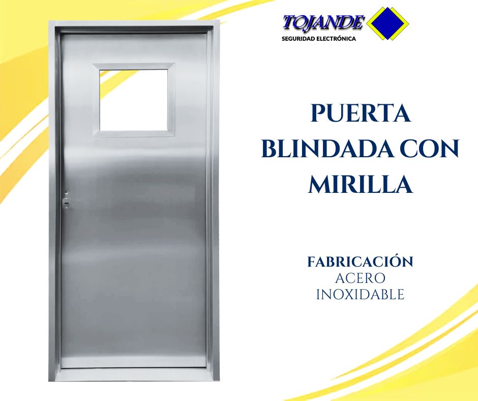 FABRICAMOS Y COMERCIALIZAMOS PUERTAS BLINDADAS CON ACABADO DE ACERO INOXIDABLE TIPO 304 CON MIRILLA CUADRADA DE VIDRIO ENMALLADO DE 12 MM, UN DISEÑO ELEGANTE Y DISCRETO.