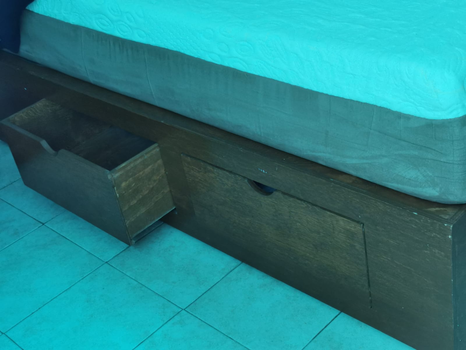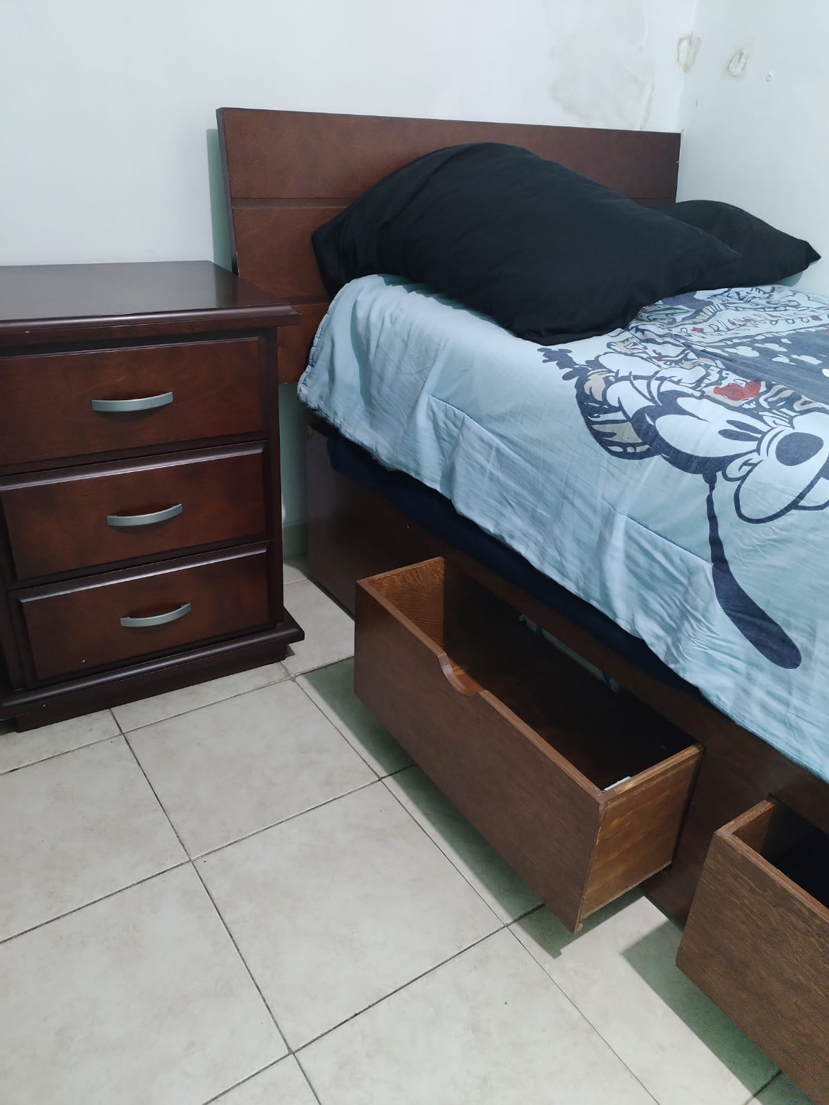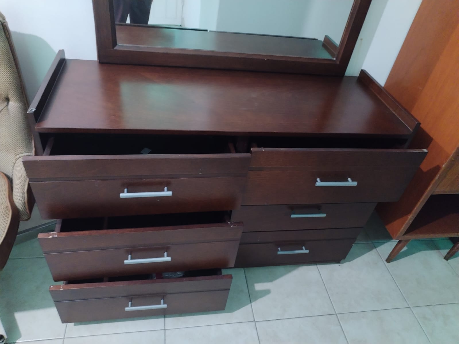 Recámara individual: La base es de madera de pino con cajones y colchón américa usado. Cabecera, un buro de tres cajones grandes, y tocador con luna de madera de álamo de alta calidad, semi nuevo y muy bien cuidado.