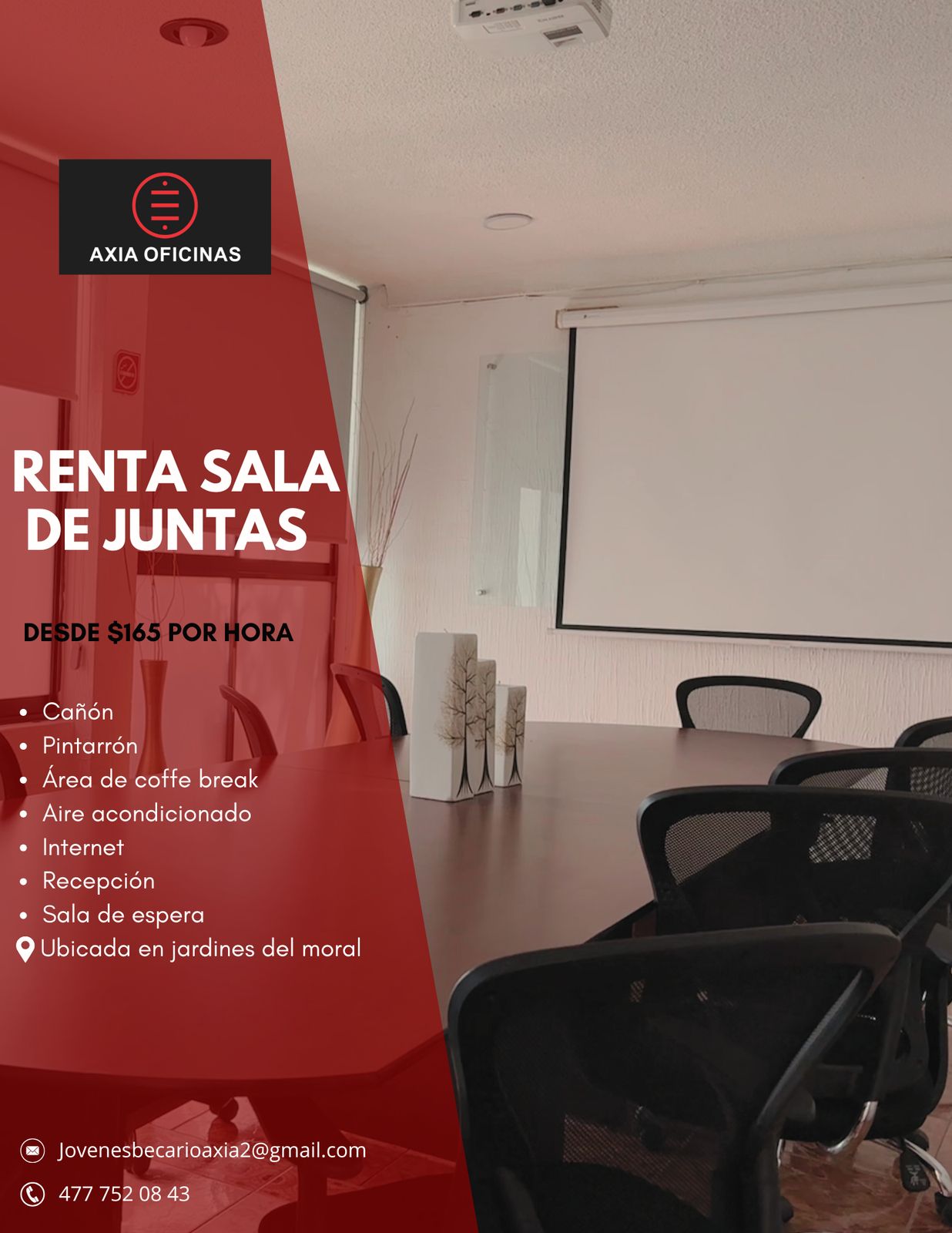 Axia Oficinas, te brinda una sala de juntas para tus eventos, tallares, cursos y capacitaciones.