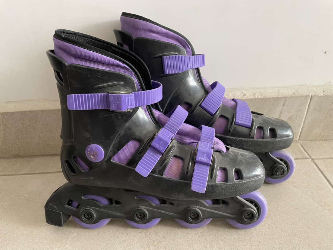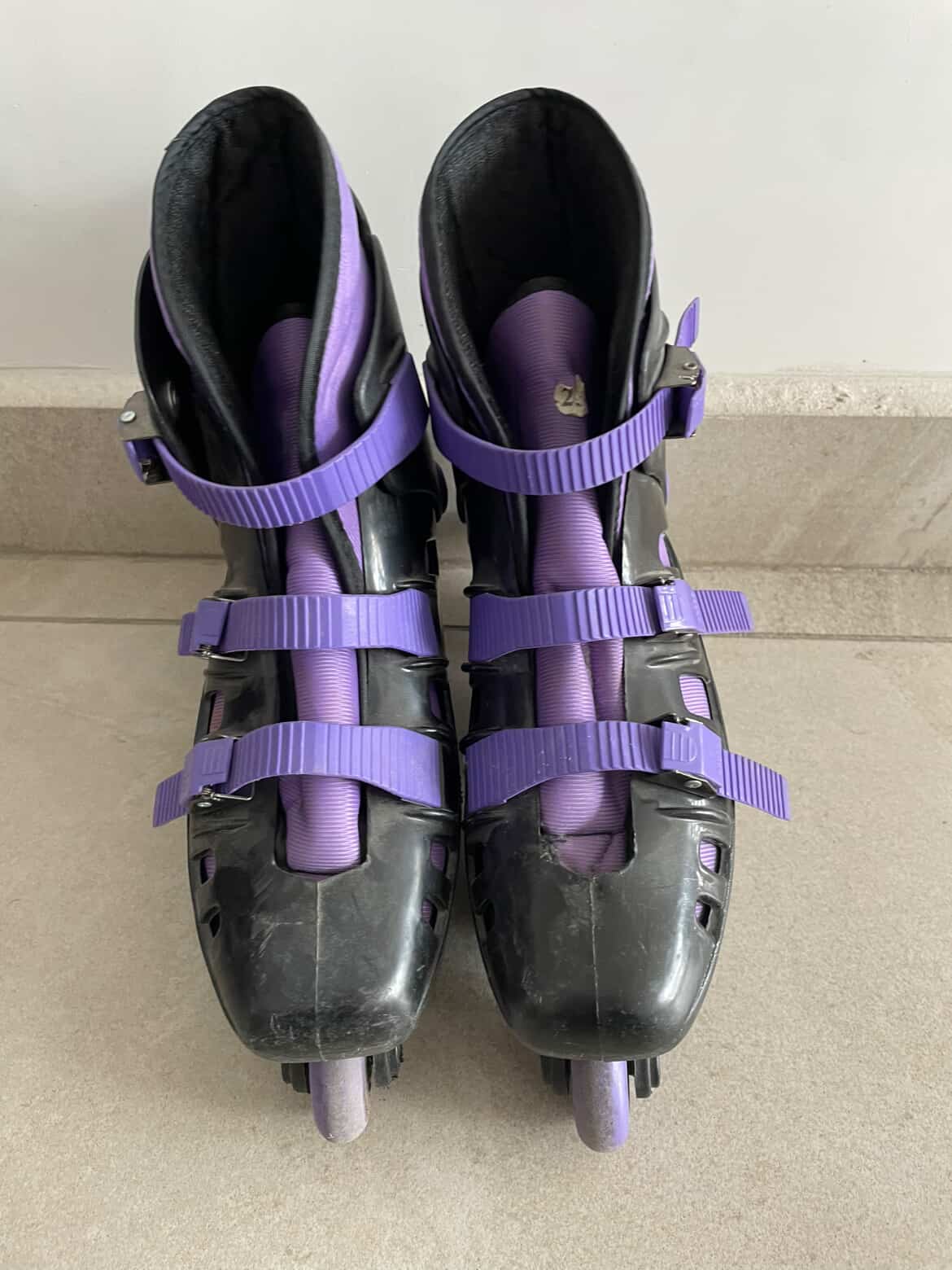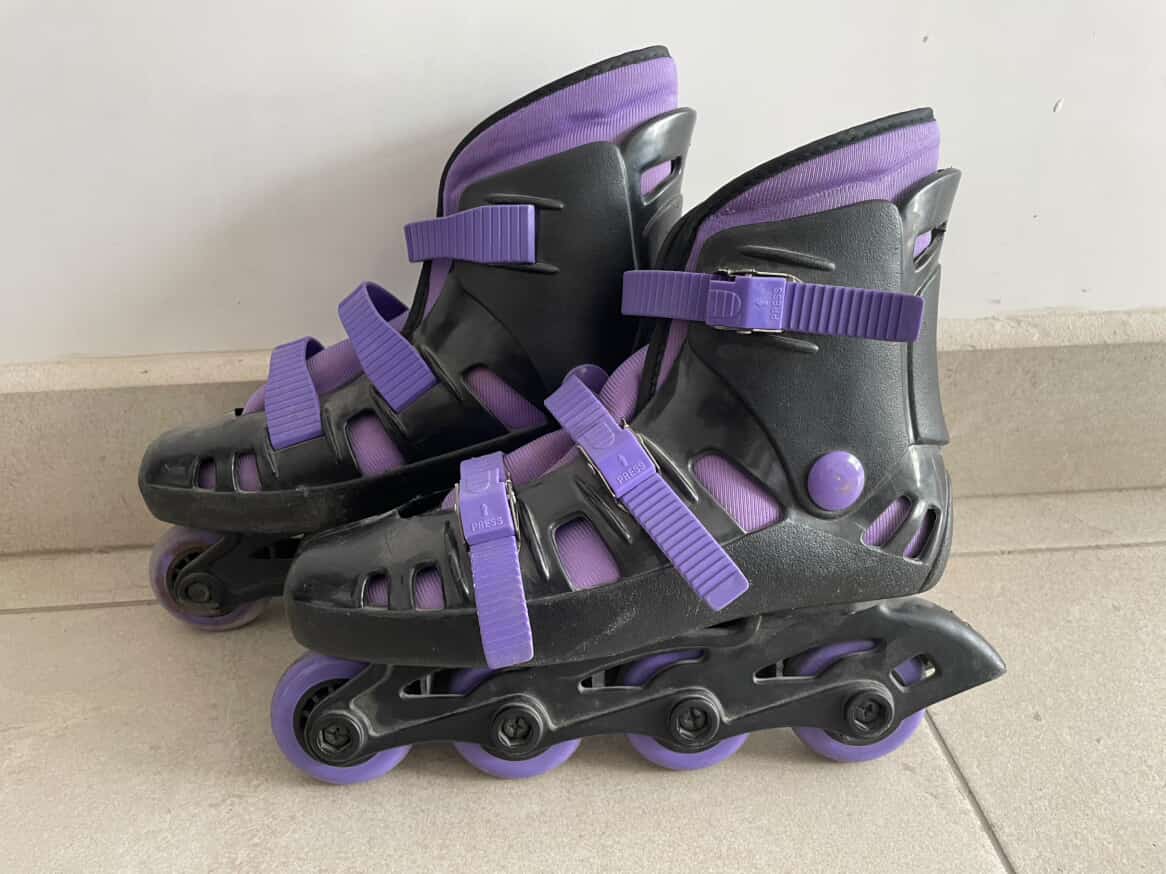 Patines en lineal. Color púrpura con negro. Talla 5. Son usados, pero muy poco. Están ligeramente dañados, pero son totalmente usables.