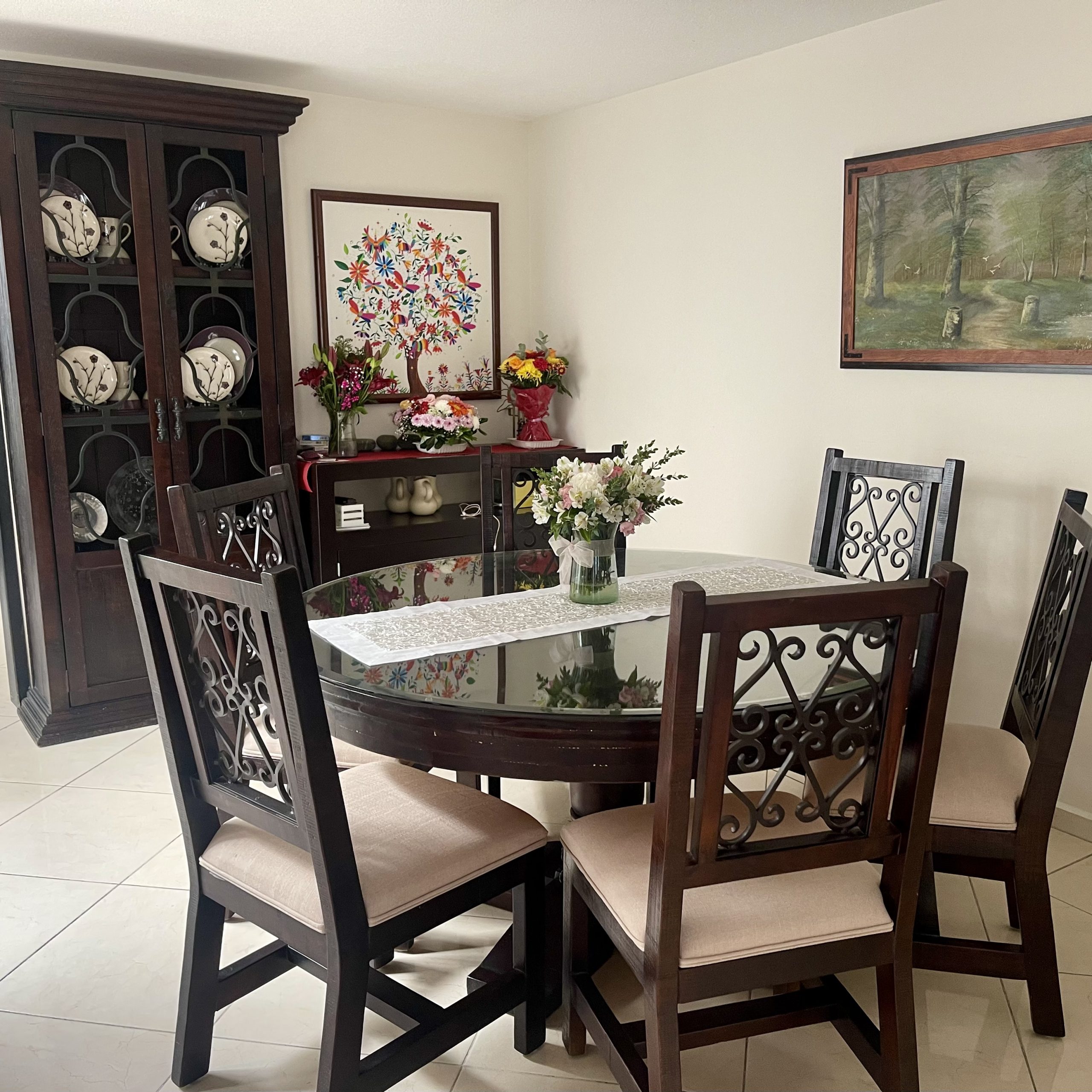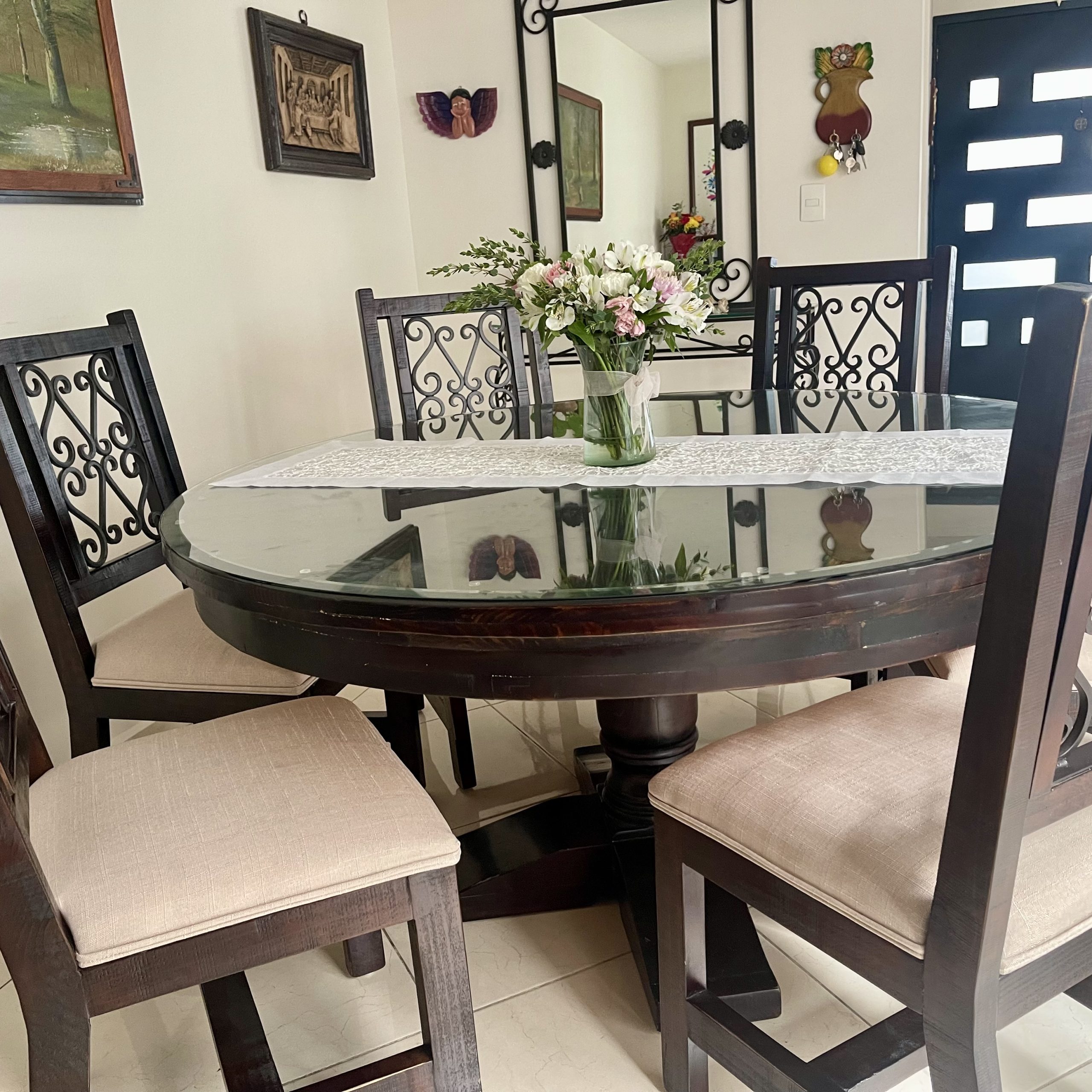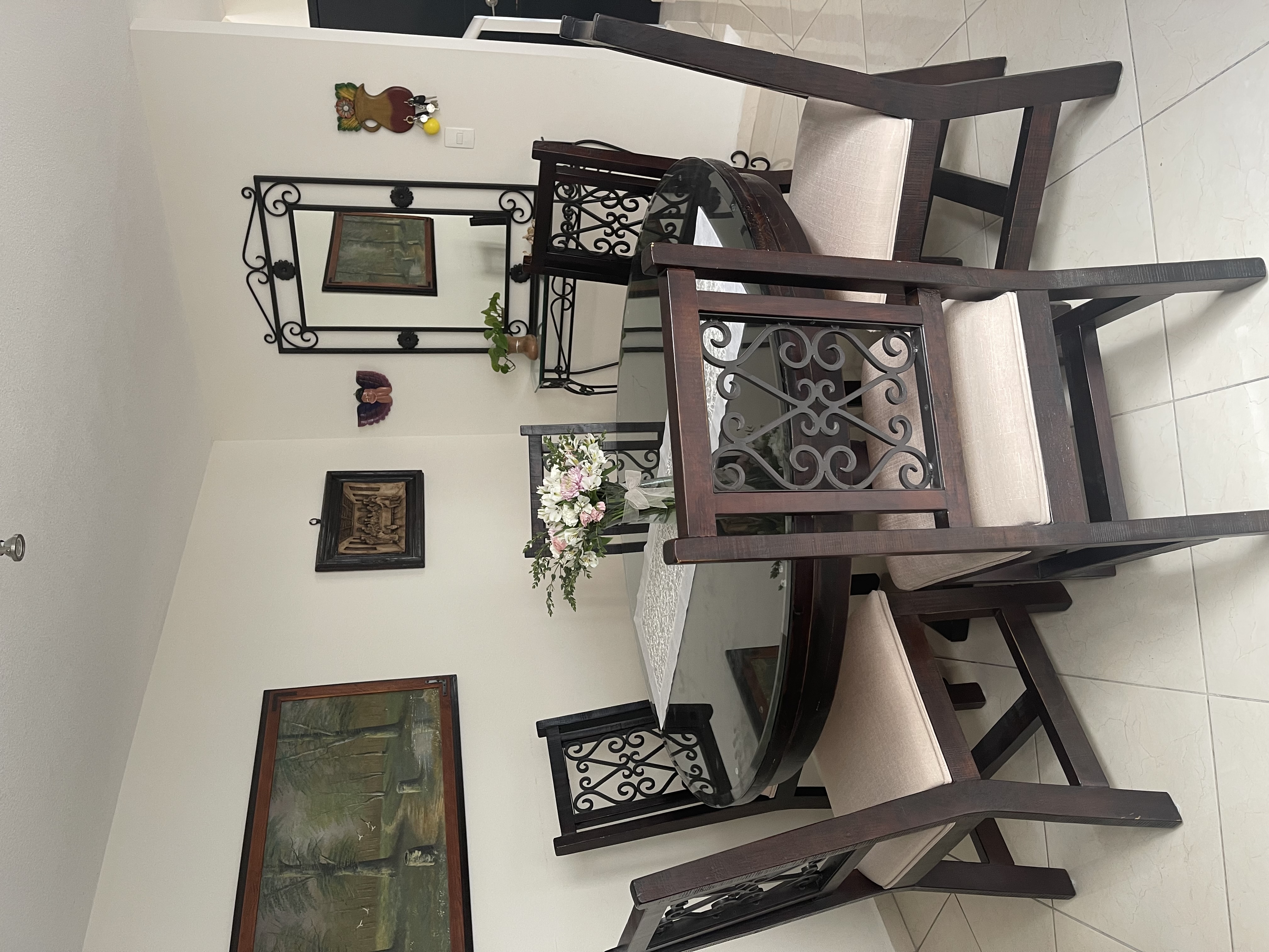Comedor redondo 6 sillas madera y forja, estilo rústico, en magnífico estado