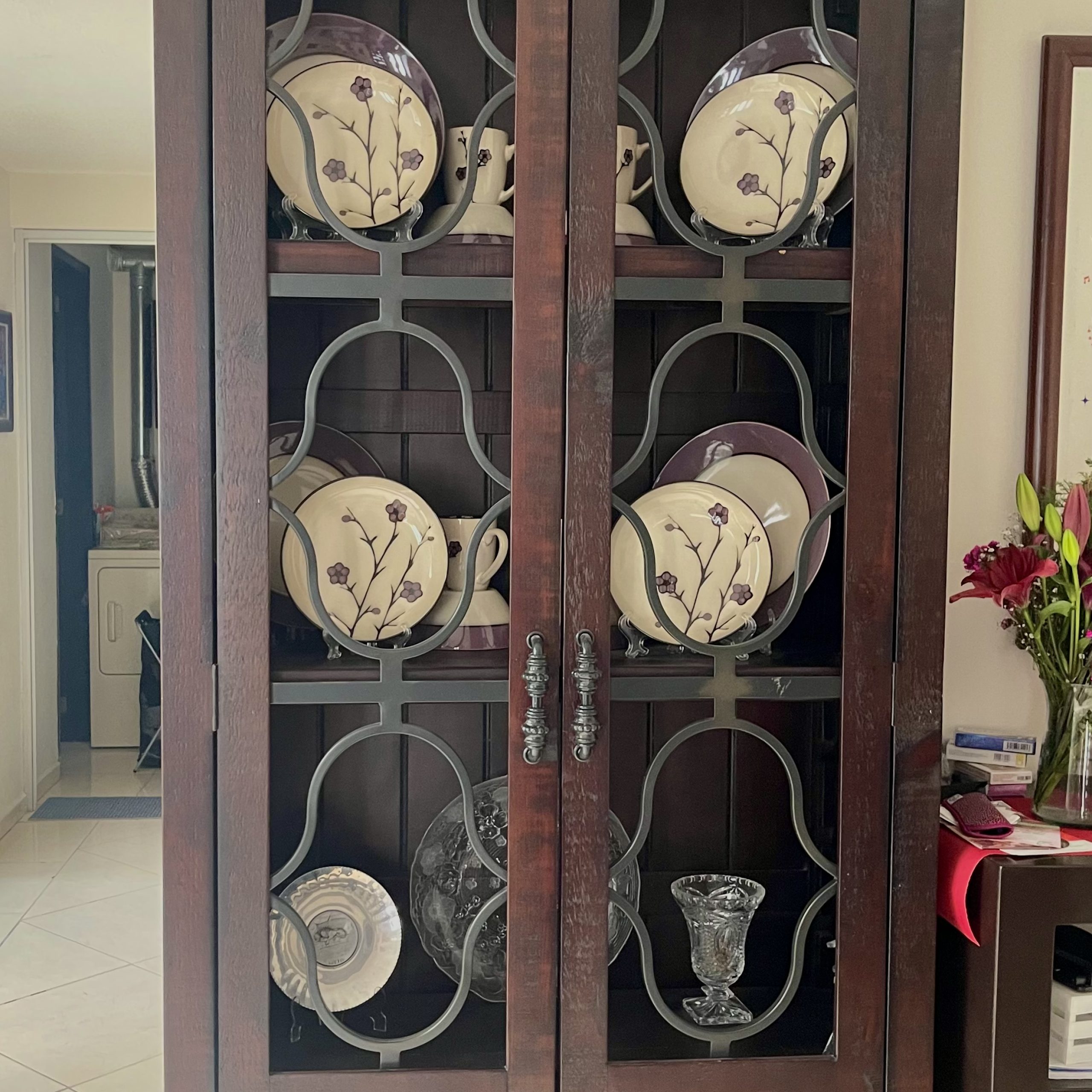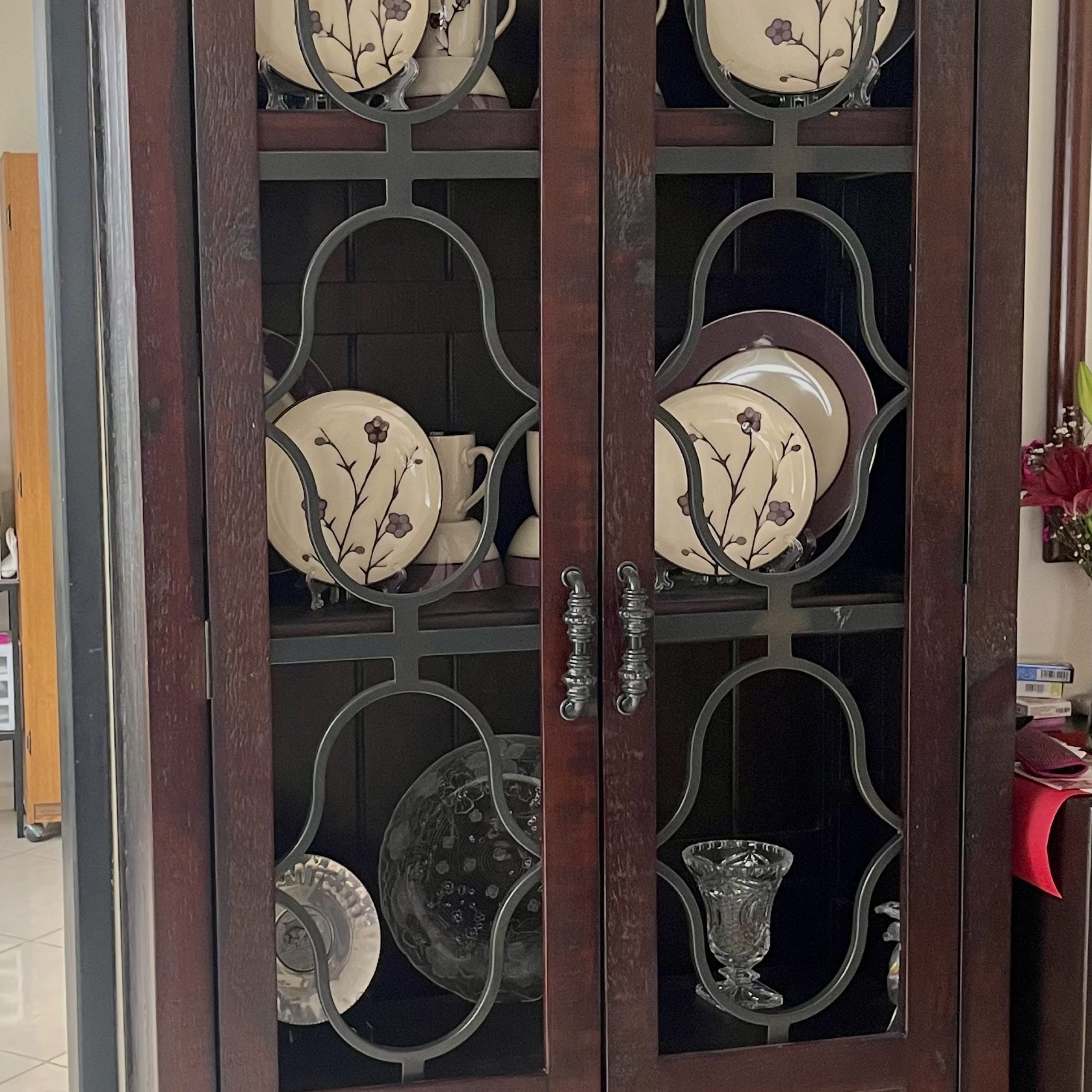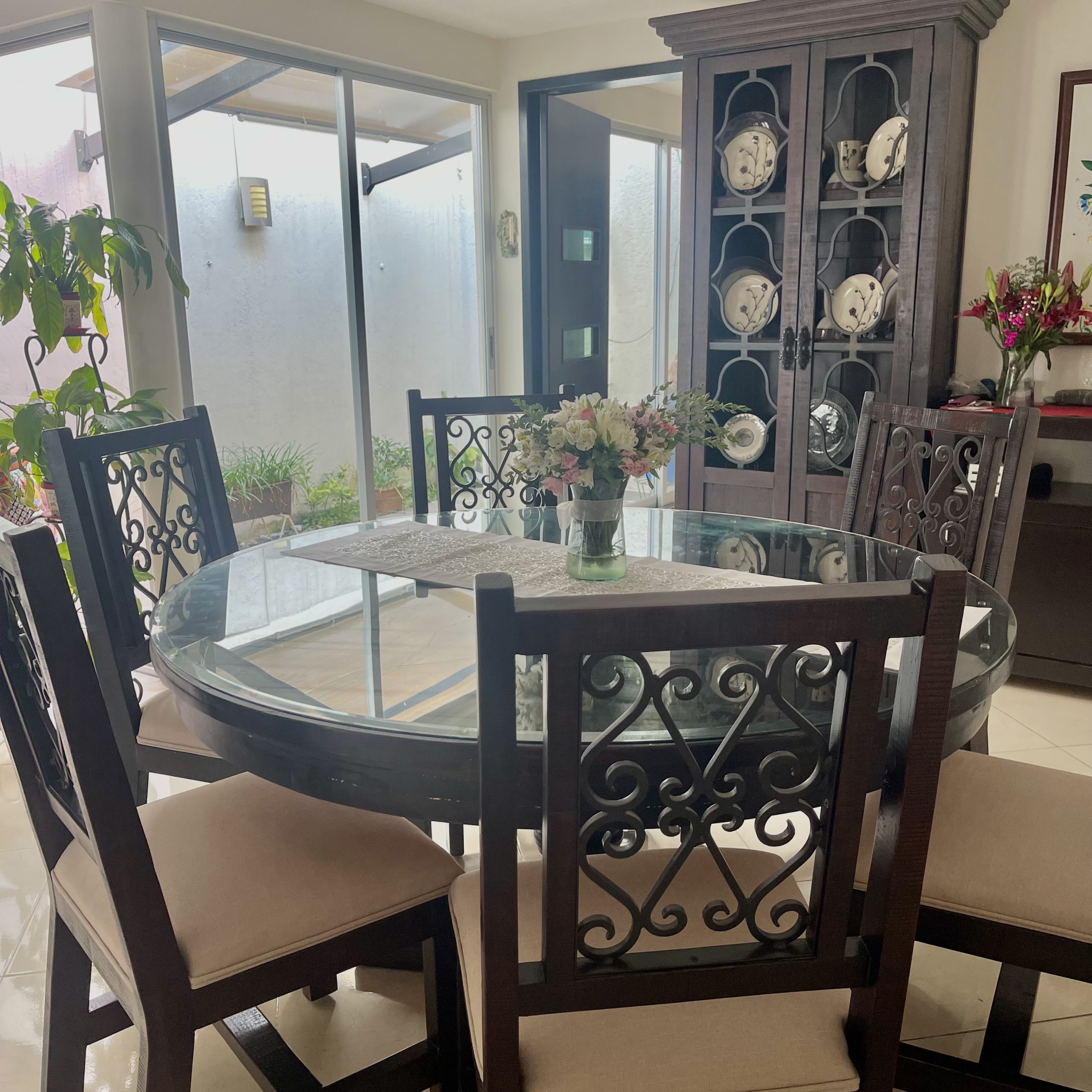 Comedor redondo de madera parota y forja estilo rústico contemporáneo, marca Ferazzi, color chocolate, con 6 sillas de madera y forja cobre, tapiz Decopla, tono Alabastro. Con Vitrina a juego misma madera, 3 entrepaños y cajones con doble puerta en parte inferior.