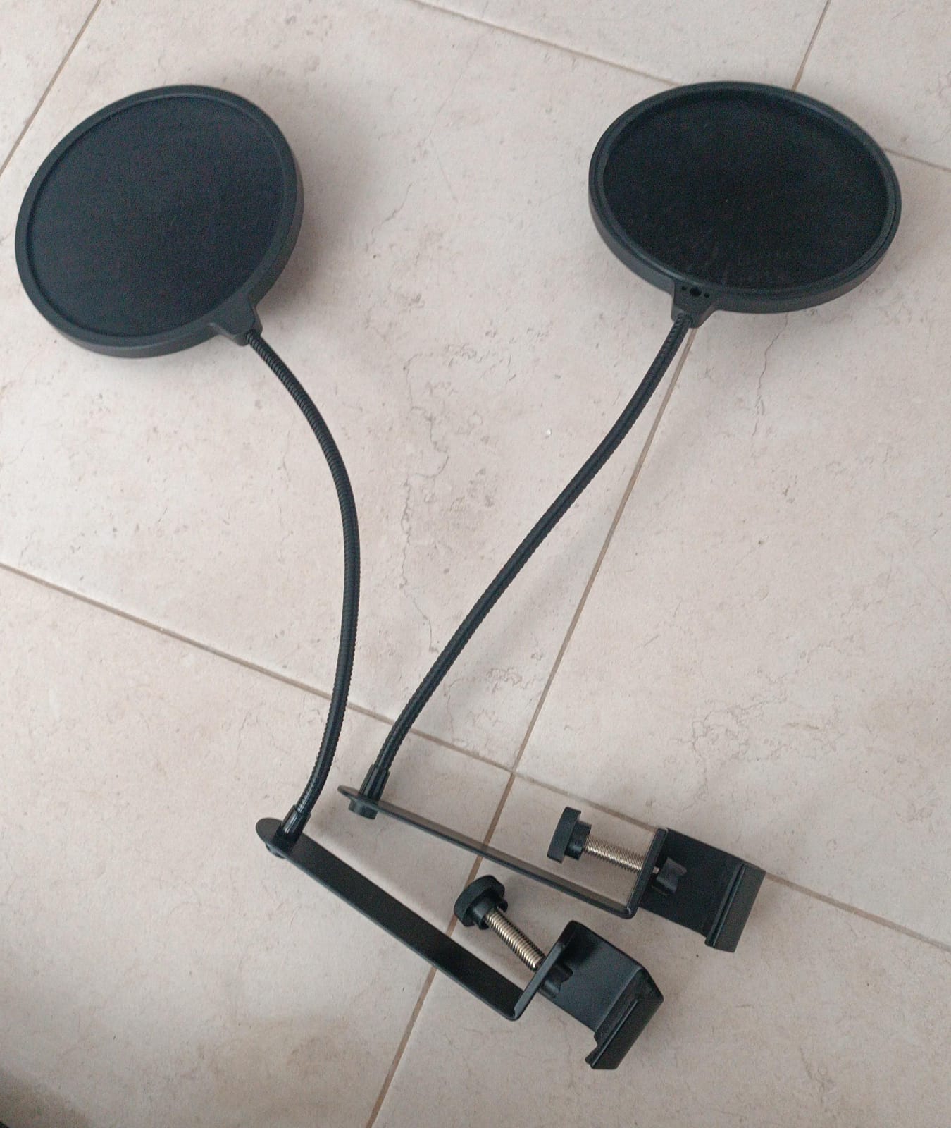 2 micrófonos con soportes, brazos articulados y bases